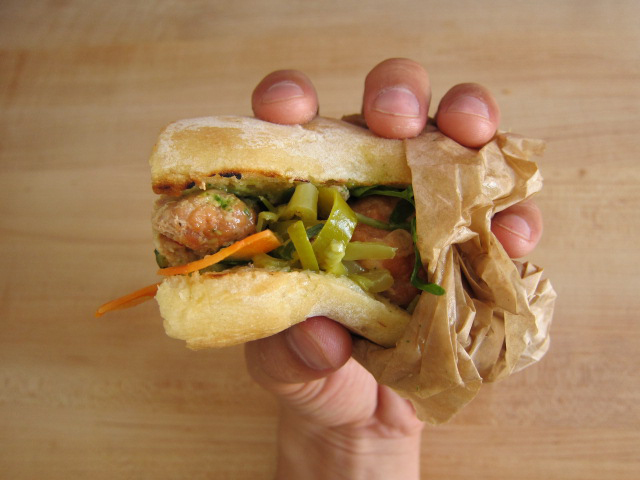 Here's a thoughtful approach to sandwich-to-mouth delivery from Eater Jeff in San Francisco (along with Jeff's above demonstration photo):