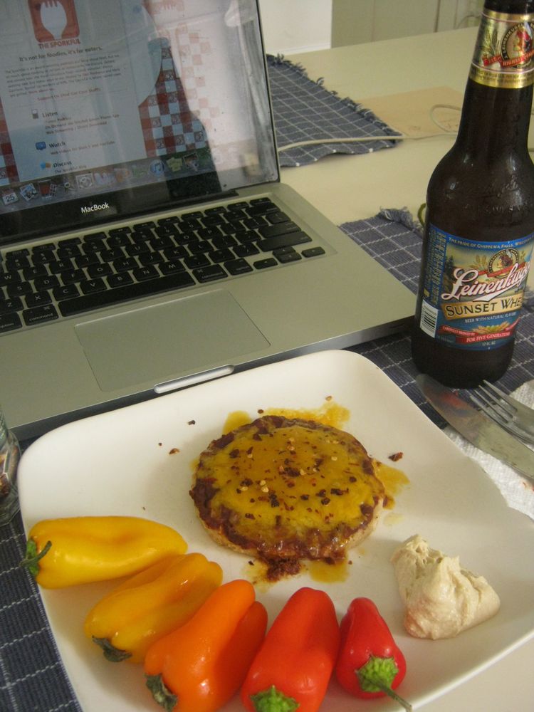 This is my post-workout lunch: fake chicken patty, Trader Joe's bean dip (which is a lot more vinegar-based than your typical bean dip so it has the illusion of being lighter on the stomach allowing you to eat more), sharp cheddar cheese (because mild is for pansies), with a side of lemon-heavy hummus and very-lazy-person-friendly mini sweet peppers. With a Leinenkugel Sunset Wheat on the side. All the textures and temperatures make this a truly satisfying meal.